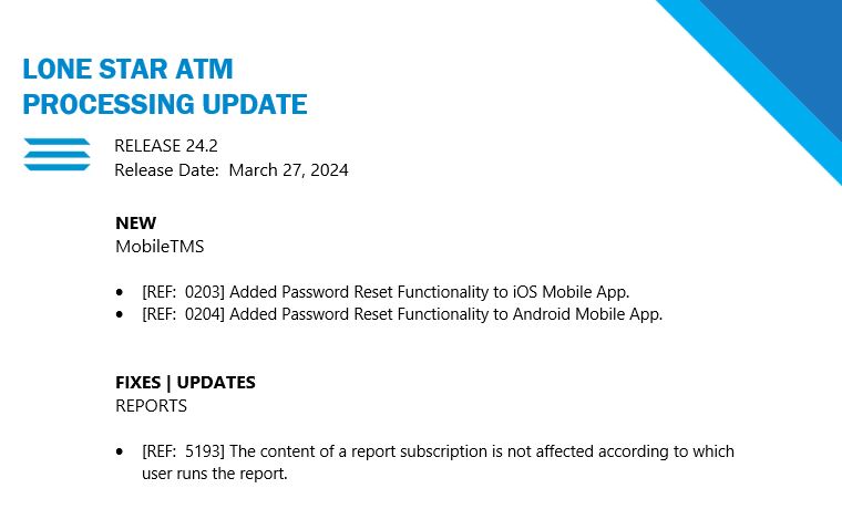 Lone Star Update 24.2 | Release Date March 27, 2024 Cathy Cranford March 25, 2024 20:36 Updated ReleaseNotes 24.2.JPG 40 KB Download Comments 0 comments Please sign in to leave a comment.