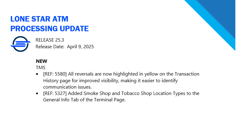 Lone Star Update 25.3 | Release Date April 9, 2025 Cathy Cranford April 07, 2025 19:52 Updated Related articles Lone Star Update 25.2 | Release Date March 12, 2025 Recent ATM Software Versions and Release Dates Std 1 TCP/IP Internet Passthrough Box for Hyosung Lone Star Update 25.6 | Release Date July 16, 2025 Comments 0 comments Please sign in to leave a comment.