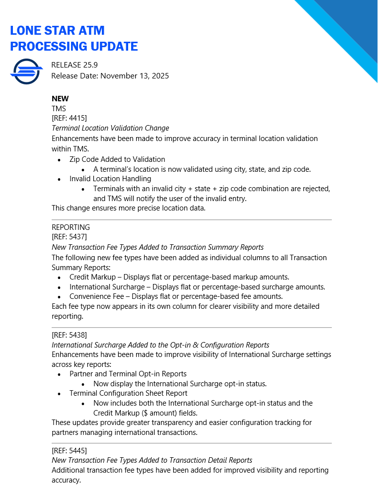 Lone Star Update 25.9 | Release Date November 13, 2025 Cathy Cranford November 13, 2025 16:34 Updated Comments 0 comments Please sign in to leave a comment.